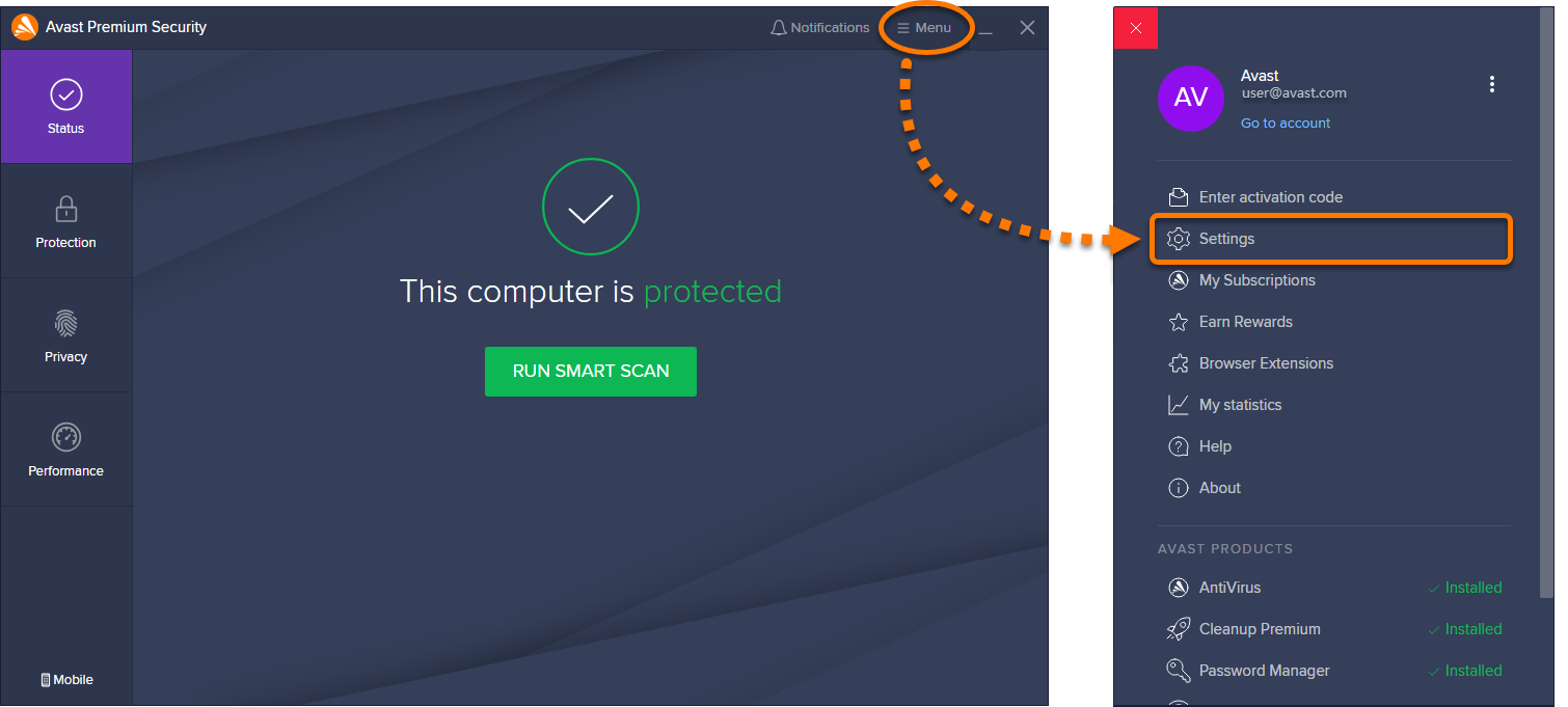1) Abra o Avast Antivirus e acesse ☰ Menu ▸ Configurações